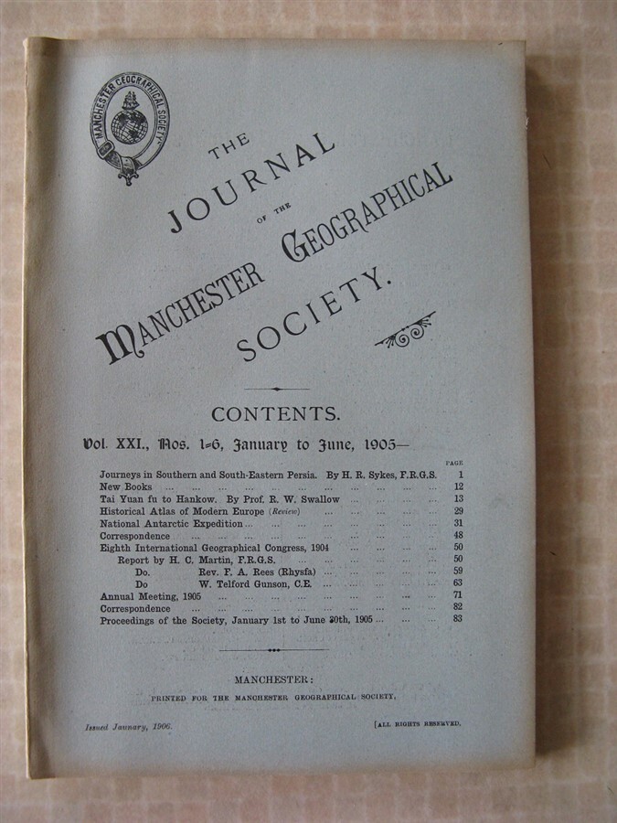 Author Various Title Journal of the Manchester Geographical Society: Vol XXI, Nos. 1-6. January - June, 1905. Price £10.00 Full Details